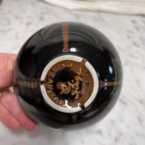 Skålfad af stentøj af Stig Lindberg for Gustavsberg; modelleret med to hanke, dekoreret med glasur i rødbrune farver; sign. Stig L med studiohånd.
