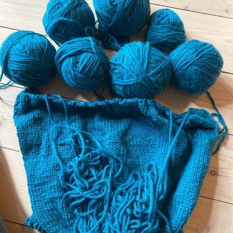 Hjemmestrikket sweater med flerfarvet mønster i beige, blå og gult