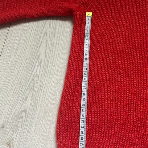 Hjemmestrikket trøje i beige med flerfarvet mønster i blå og gul. Trøjen har rund hals og lange ærmer. Strikket i blanding af alpaca og uld, silke mohair.