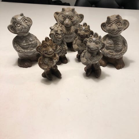 Krølle Bølle sparebøsse fremstillet i keramik. Figuren forestiller en karakter med store ører og næse, med tekst 'KRØLLE BØLLE' på maven. Den er sjælden