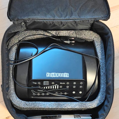 Kompressionsapparat til ben med justerbare luftkamre og medfølgende fjernbetjening. Designet til at forbedre blodcirkulationen og reducere hævelse i benene. Farve: sort.