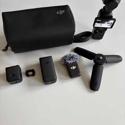 DJI Pocket 3 kamera med tilbehør. Inkluderer et kompakt kamera med håndholdt gimbal, opbevaringsetui, ekstra batteri, oplader, USB-kabel, beskyttelsescover og forskellige monteringsdele. Kameraet er designet til at optage video og billeder med stabilisering og mobilitet.