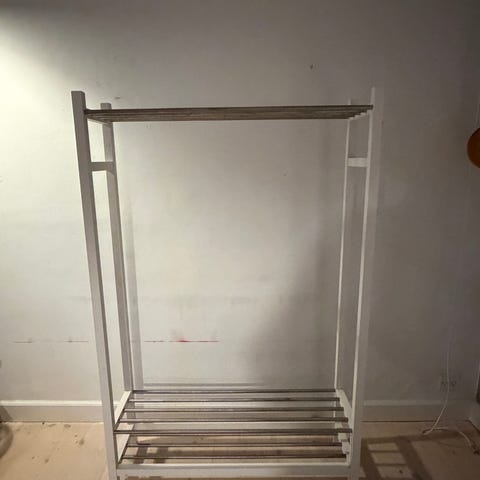 IKEA garderobestativ med hylde til opbevaring af tøj og sko. Garderobestativet har en stang til ophængning