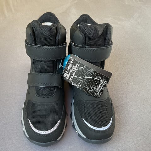 Viking unisex børnestøvler i størrelse 31. Støvlerne er designet til børn og har en varm foring, som ses på billederne. Materialet inkluderer tekstil og syntetiske komponenter. Velegnet til udendørs brug i koldt vejr.