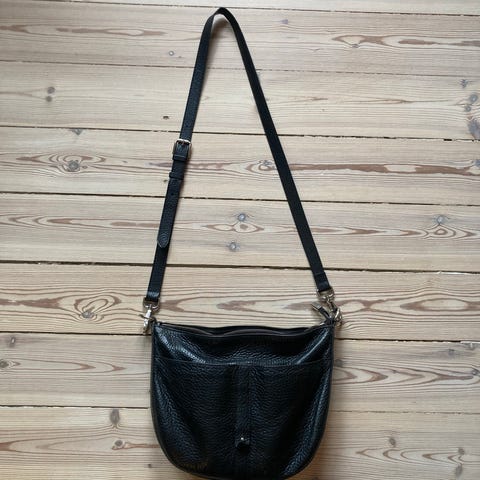 I brun fløjl og orange/gule cirkler (i PU), fra Skyline, det store rum er opdelt i 2 + der er et mindre rum til småting, desuden 1 rum "udenpå" tasten, måler 36 cm (bredde) x 29 cm (højde) x 10 cm (dybde), skulderremmen kan indstilles, aldrig brugt