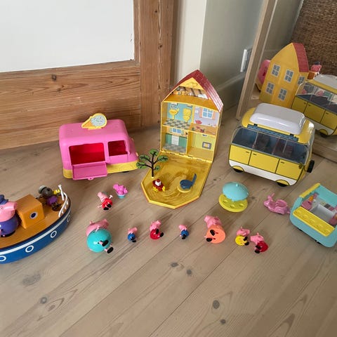 Bilen og båden har hjul under og kan køre/sejle. De er i træ og figurerne er i hård plast. De er ikke købt sammen, men har fin legeværdi alligevel.
