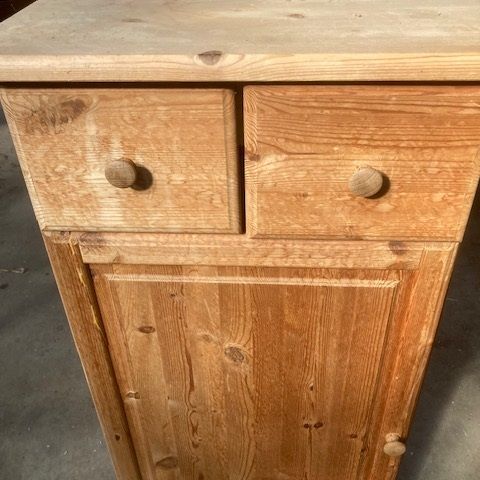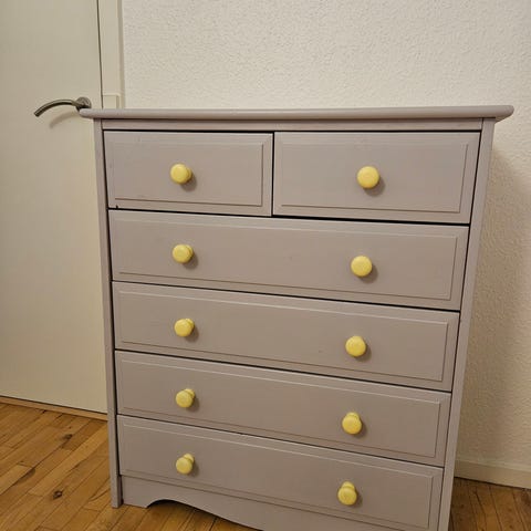 Ældre kommode med 6 skuffer - malet lilla med hvide ben søger nyt hjem og evt ny gang maling.