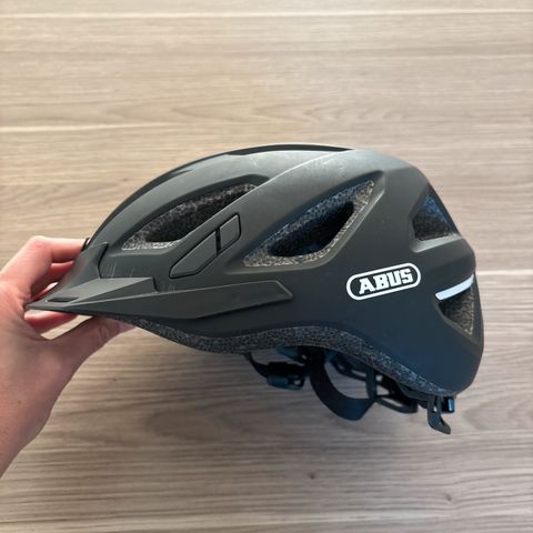 Abus Lazer cykelhjelm i sort med integreret baglys. Hjelmen har ventilationsåbninger og justerbare remme for bedre pasform. Designet til at give beskyttelse under cykling og øge synligheden i trafikken med baglyset.
