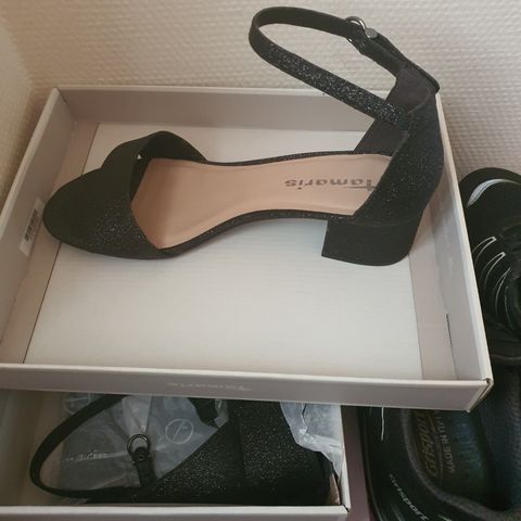 Tamaris festsko i størrelse 39. Skoene har en lukket spids og ankelrem med spænde. Farven fremstår som lys og skoene har en medium hælhøjde. Velegnet til formelle lejligheder.