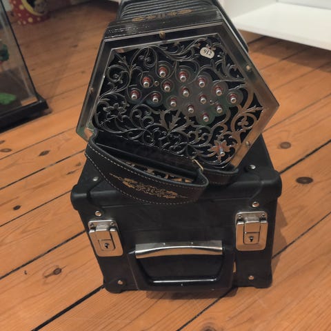 The Concertina Company Concertina trækspil med træ og metal. Instrumentet har knapper til afspilning og et bærehåndtag. Leveres med en beskyttende taske og en kvittering for købfra 12.06.2024. Nypriser 2500 euro (18.570 dkk) fra firma Watterott. Kan spilke 20 forskellige lister.