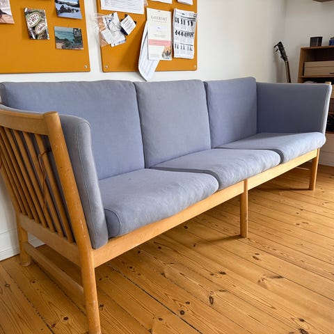 Svenskt Tenn sofa designet af Hans J Wegner med stel i træ og gråt stofbetræk. Sofaen har en åben ryg med spiler og en enkel, funktionel konstruktion. Egnet til brug i stue eller opholdsrum.