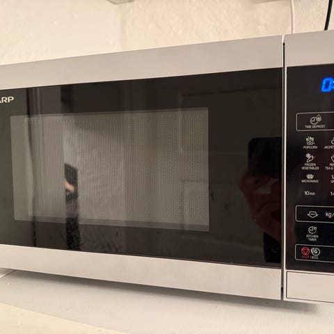 Sharp mikrobølgeovn i stål med drejeknapper til justering af effekt og tid. Enheden har en drejeskive indvendigt og en enkelt dør med sikkerhedslås.