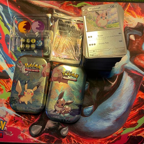 Jeg sælger 12 metalæsker med 60 ægte Pokémonkort i hver. Kortene er som nye og kommer direkte fra åbnede pakker.