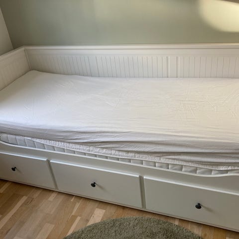 IKEA seng med skuffer i hvid farve. Sengen har opbevaringsskuffer under liggefladen. Designet med paneldetaljer på sider og ryg. Egnet til enkeltpersoner og kan bruges som dagsseng eller sovesofa.