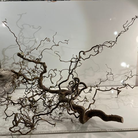 Troldhassel-gren i naturfarvet træ. Grenen har en snoet og dekorativ form, som gør den yderst velegnet til brug som dekoration i hjemmet eller til kreative formål.