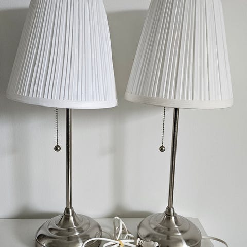 Jeg sælger disse to bordlamper fra Ikea. De er næsten lige købt, så de fejler ingenting. Pærerne følger med og de virker. Ny pris 99 kr. stk. jeg sælger begge to for 100 kr.
