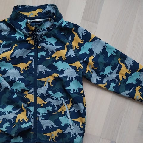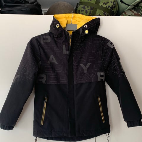 Str 128-134, åndbar, vind og vandtæt, meget let, har lynlås og trykknapper og justerbar elastik i taljen. Der er en mini plet og slid på guldknapperne eller megrt meget fin
