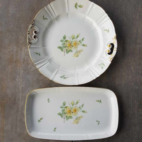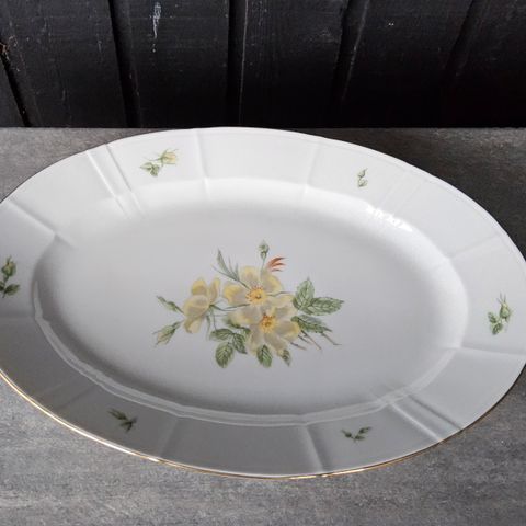 Stellet er dekoreret med lige knækkede kanter og gule klitrose blomster samt kantet med bred guldkant. Vintage oldemor det originale stel fra ca. 1965.