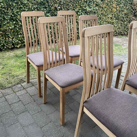 Spisebordsstol, Sæbebehandlet bøg, Findahl by Hammel. Stolen er stabelbar og har en flot og sofistikeret ryg. 650 kr. pr. stk.