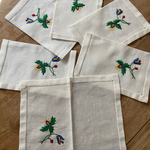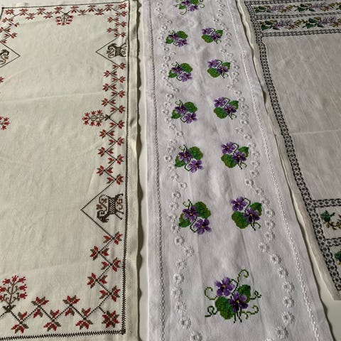Håndbroderet med korssting, figurer i sort, omgivet af blomster i rød, gul og grøn.
