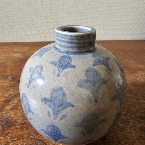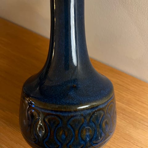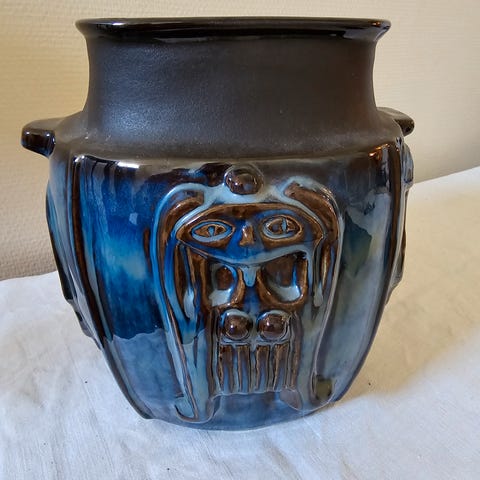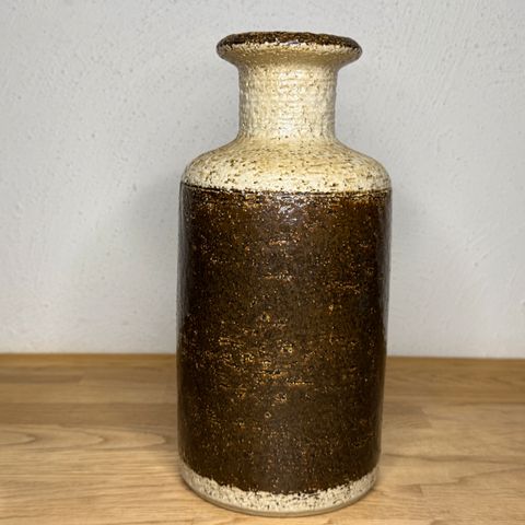 F.V.J.D. vase i keramik med blå og brun glasur. Fremstillet i 1971 i Odense. Vasen har et dekorativt mønster med firkantede elementer.