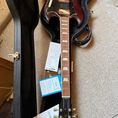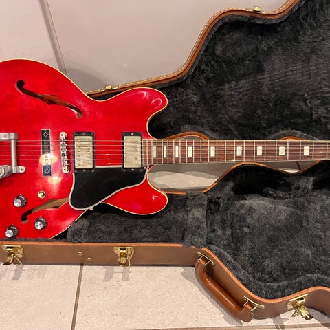 En sort Gibson Midtown Bigsby fra 2012, lavet i USA. Der er et par mindre skrammer bagpå, ellers i fin stand.