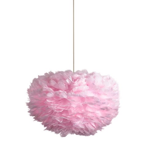 Hver fjer er omhyggeligt udvalgt og nænsomt fastgjort for at forme lampens bløde, luftige silhuet – som en sky, der svæver roligt gennem rummet. Det naturlige fjerlag filtrerer lyset på smukkeste vis og skaber et stemningsfuldt og organisk lysspil.