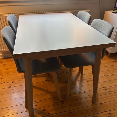 Plads til 6 personer, kan udvides til 8-10 personer med de to tillægsplader i hollandsk udtræk. Jeg har brugt bordet med 12 personer.