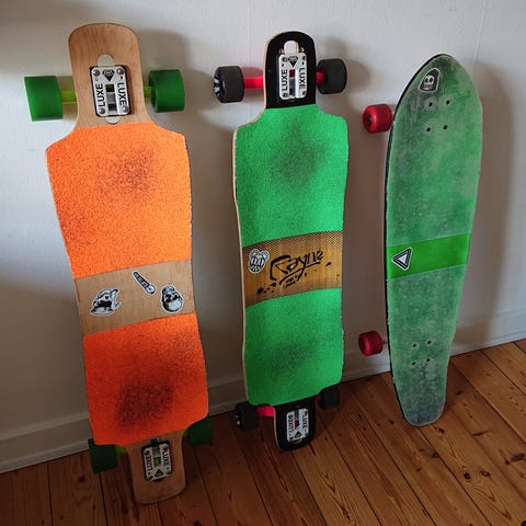 Mindskes longboard trucks og hjul i rød farve. Sættet inkluderer to trucks og fire hjul. Trucks er lavet af metal, og hjulene er fremstillet i rød plastmateriale. Passer til brug på longboards.