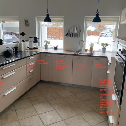 Køkkenmoduler i træ med bordplade og indbygget vask. Modulerne inkluderer overskabe, underskabe og hylder. Designet til opbevaring og funktion i køkkenmiljø. Farve: træfinish. Materiale: træ. Inkl keramisk komfur og emhætte ekskl. køleskab kan afhentes efter den 10/2