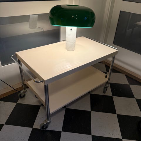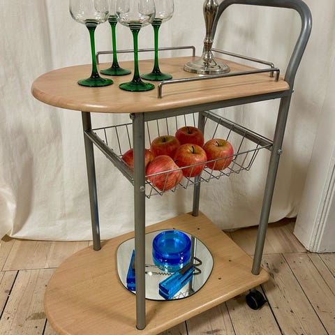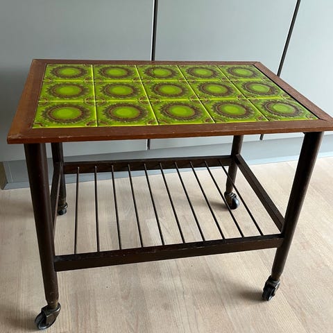 Dette rullebord eller drinksbord eller sidebord eller hvad vi skal kalde det er formentlig fra 1980erne. Brunlakeret træ og finér og med sorte møbelhjul af plast. Disse binder en smule.
