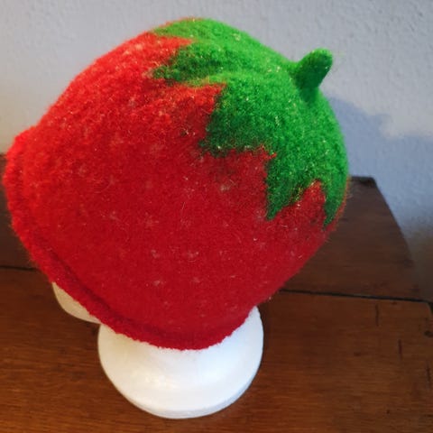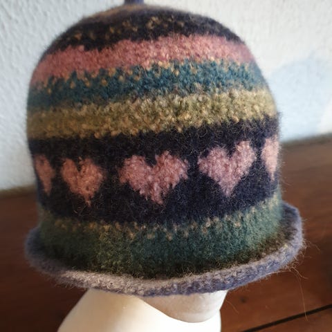 Jeg har strikket huen i 100% uld og filtet den.