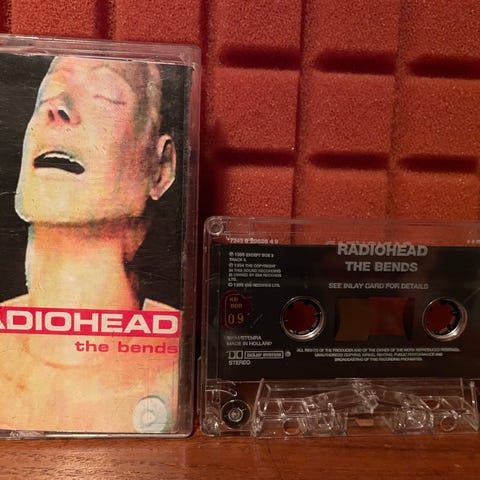 AI: Radiohead OK Computer kassettebånd med cover og indlæg. Indeholder albumsporet fordelt på to sider. Kassettebåndets materiale er plast.