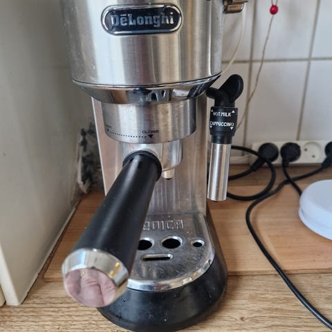Delonghi kaffemaskine med indbygget kværn, virker som den skal, kan lave barista kaffe.