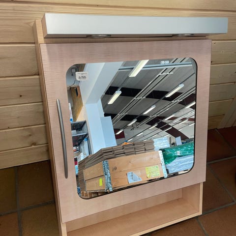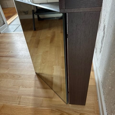 Spejlskab i rustfrit stål med spejldør og indvendige glas hylder. H 80cm B 30cm D 15cm. Skabet har en rektangulær form og kan anvendes til opbevaring i badeværelse eller lignende rum. Købt i Bad &Stil.