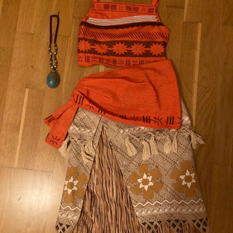 Kjolen er multifarvet og fremstillet i polyester. Den har detaljer inspireret af karakteren Vaiana fra Disney. Den er næsten som ny.