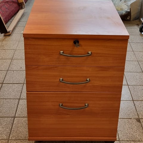 Langt skrivebordsmøbel / arkivskab i lyst træ, med afrundede hjørner og tre skuffer. ,Afhentes i:,Røde Kors Bellinge (461),Bemærk at mail, chat og beskeder ikke besvares, og varen skal købes på knappen "Gå til varen"