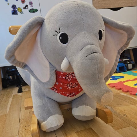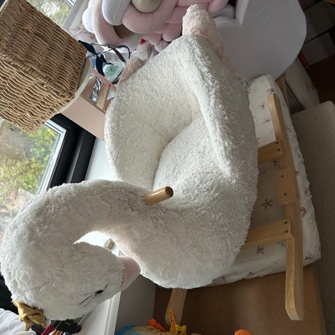 Jollyroom gyngedyr til børn formet som svane. Hovedet har en lille gylden krone. Lyserøde og hvide farver dominerer. ,Afhentes i:,Røde Kors Bellinge (461),Bemærk at mail, chat og beskeder ikke besvares, og varen skal købes på knappen "Gå til varen"