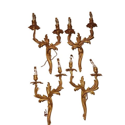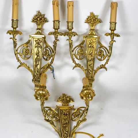 Tre væglamper i messingsudseende fra Frankrig i antik stil med Louis XIV-inflydelse, fra omkring 1850–1900, gilded, med tre fatninger og i god brugt stand, fungerer, samlede mål ca. 44×32×20 cm (to mindre lamper måler 40×22 cm). Klik på den blå "gå til varen" knap, for at købe eller byde på denne vare. Den samlede pris vil blive vist inden du afgiver dit bud.