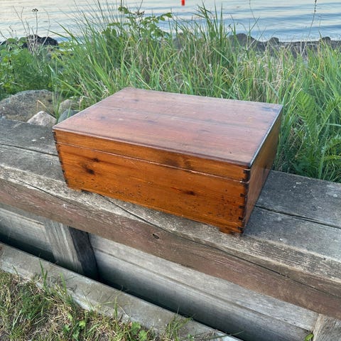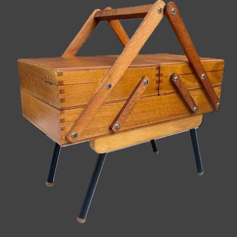 Træv/æderen gammel ballonformet sy-kasse i træ, model Ancienne grande boîte de couture en forme de ballon, fremstillet i Frankrig, ca. 1960–1970, i god brugt stand med små aldersslidninger, højde 36 cm, bredde 20 cm, dybde 20 cm. Klik på den blå "gå til varen" knap, for at købe eller byde på denne vare. Den samlede pris vil blive vist inden du afgiver dit bud.