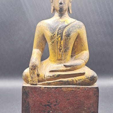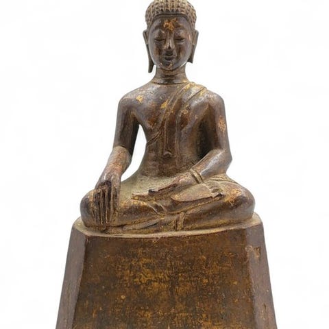 Antik, håndskåret skildring af Shakyamuni Buddha, den historiske Buddha, lavet af massivt træ med originalforgyldning. Figuren viser Shakyamuni i en rolig, kontemplativ meditationsstilling. De lukkede øjne, de harmonisk modellerede ansigtstræk samt de forlængede øreflapper symboliserer indre samling, visdom og åndelig fuldbyrdelse.