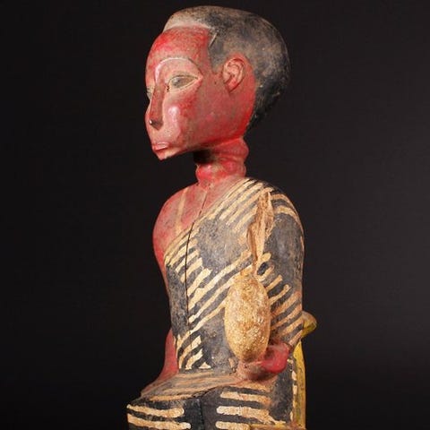 Bronzemaske, en Baule-replik fra Elfenbenskysten, lavet af bronze, 22 cm høj, 14 cm bred, 6 cm dyb, vægt 970 g, uden stand. Klik på den blå "gå til varen" knap, for at købe eller byde på denne vare. Den samlede pris vil blive vist inden du afgiver dit bud.