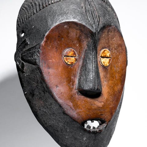 Rituelt maske med titel “Masque rituel” fra Ituri-skoven i Den Demokratiske Republikken Congo, dateret til midten af det 20. århundrede, oprindelse fra privat samling; en frontal træskulptur på 39 cm i højden, 1 cm i bredden og 1 cm i dybden, uden fod. Klik på den blå "gå til varen" knap, for at købe eller byde på denne vare. Den samlede pris vil blive vist inden du afgiver dit bud.