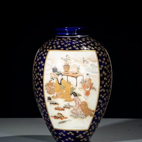Støbt i bronze med et udsmykket botan-shishi-motiv (pæon og løve), der viser rige skulpturdetaljer og en afbalanceret form.
