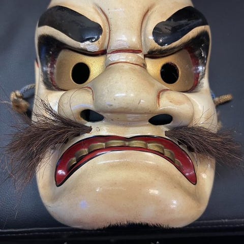 Højkvalitets japansk traditionelt håndskåret træ-Noh-maske - Koushijō 小牛尉, fint udskåret med omhyggelige detaljer. Fremstillet af Okako 丘子 i 1996 (Heisei 8) og signeret på bagsiden. Med Noh-maske taske.