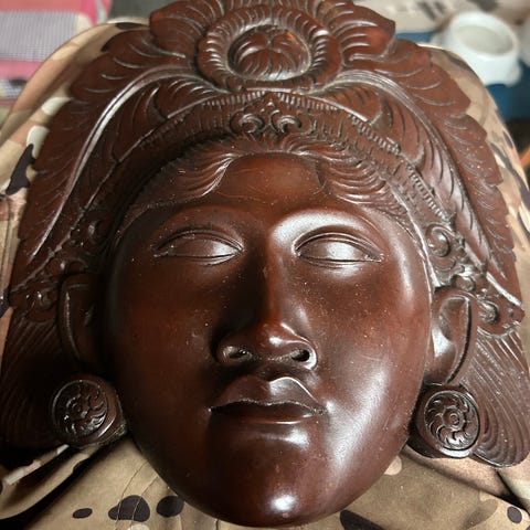 Antikt Bali-vægrelief fra Indonesien, midt-20. århundrede, udskåret i træ og afbildende tre balinesiske kvinder, med gammel patina og farver, mål 53 cm høj, 34 cm bred og 4,5 cm dyb, vægt 1,75 kg, i god stand og fra privat samling, solgt uden stand, ikke sendt til USA. Klik på den blå "gå til varen" knap, for at købe eller byde på denne vare. Den samlede pris vil blive vist inden du afgiver dit bud.