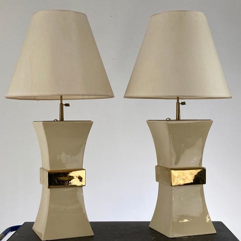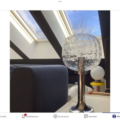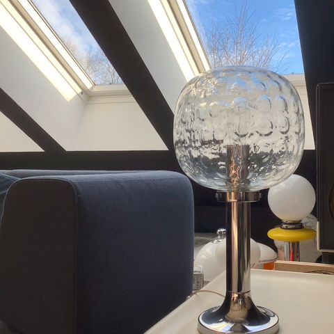 To bordlamper med klare krystalfødder og cremefarvet plisseret stofskærm, samlet højde ca. 45 cm, skærmdiameter ca. 25 cm, fatning E14, kabel uden afbryder, stil Vintage Mid-Century Modern, produceret i Italien, i god brugt stand med mindre aldersmærker og i funktion. Klik på den blå "gå til varen" knap, for at købe eller byde på denne vare. Den samlede pris vil blive vist inden du afgiver dit bud.