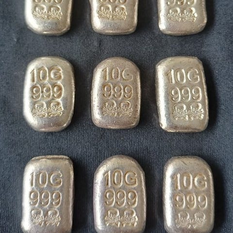10 x 10 gram støbt sølvbar af