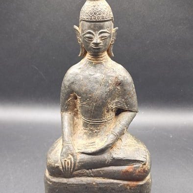 En ældgammel statue af Buddha Shakyamuni siddende i Bhumisparsha-mudra (gestus, der kalder jorden som vidne), støbt i bronze ved voksstøbning.