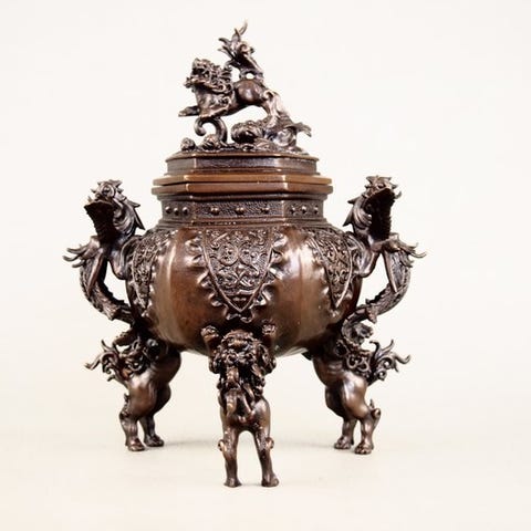 Japansk Hakudō kobber Koro røgelsesbrænder af Sano Kōsai, postwar metalskaber, med relief af kraner og skildpadder og låg med hexagonalt udskåret mønster, underlagt mærket 「宏采」, mål 14,5 cm høj, 13 cm bred, 13 cm dyb, vægt 1,516 kg, god stand med mindre alderstegn. Klik på den blå "gå til varen" knap, for at købe eller byde på denne vare. Den samlede pris vil blive vist inden du afgiver dit bud.